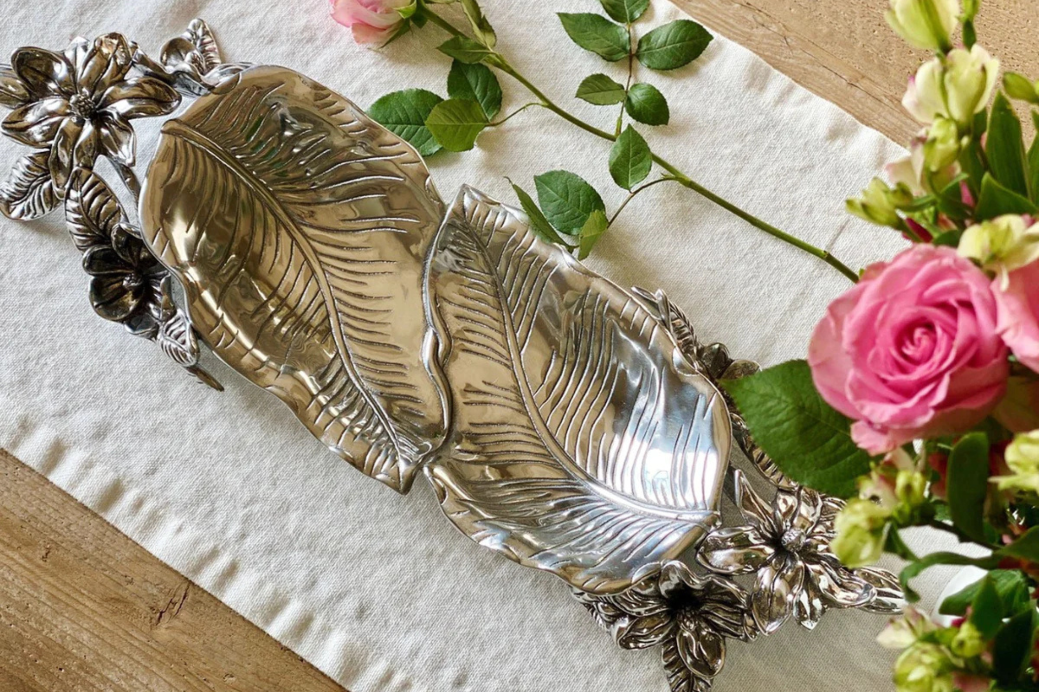 Crafted with a signature magnolia design, this piece showcases a fully bloomed flower alongside a delicate bud. The layered blossoms curve gracefully along a branch that wraps around the left edge of this handcrafted aluminum tray, making it a perfect statement piece for your table.